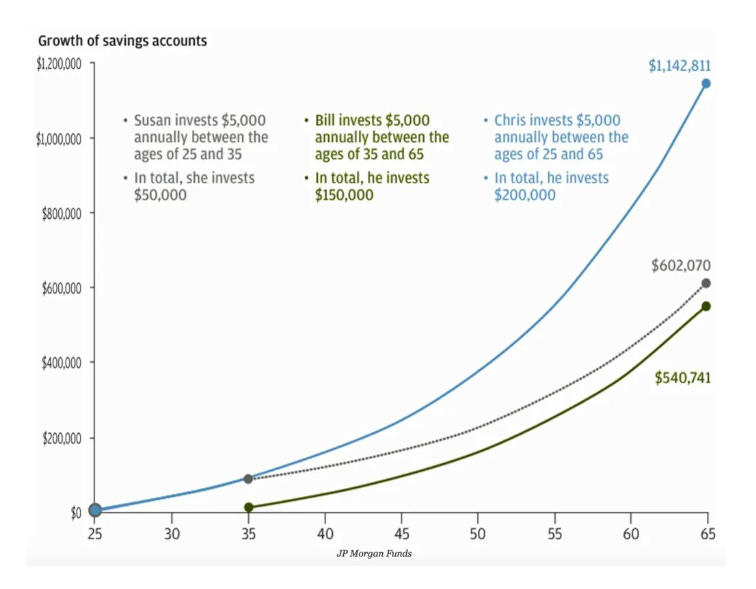 Susan (en gris) a investi 5 000 $/an de 25 à 35 ans (10 ans), puis elle s’est arrêtée. Elle a donc au total investi 50 000$.